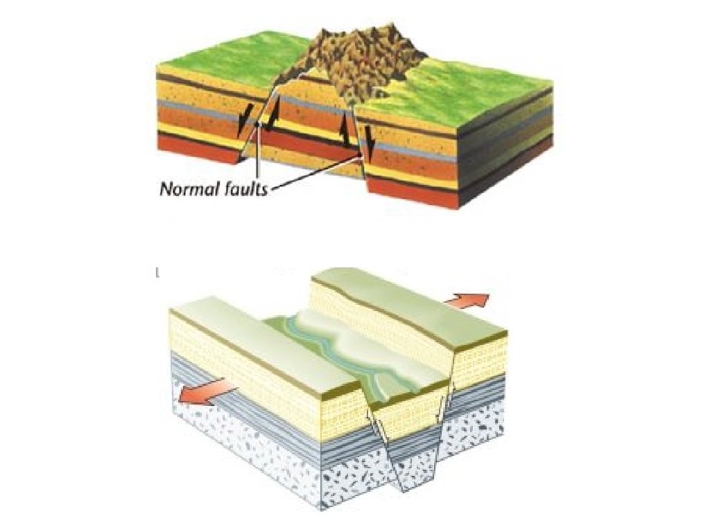 Kinds of Faults • There are three different types of faults (one for each type of stress): normal, reverse, and strike-slip. • A normal fault happens when tension pulls rocks apart (divergence). In a normal fault, the hanging wall appears to move down relative to the footwall. • Normal faults are found all along the Rio Grande rift valley in New Mexico.