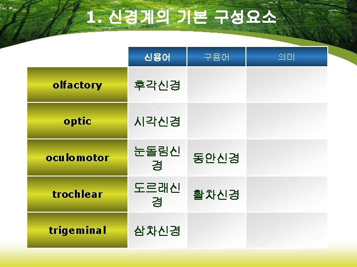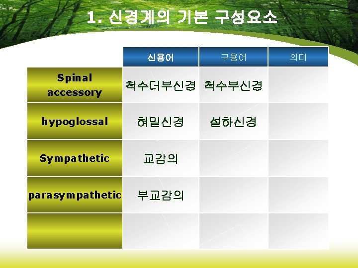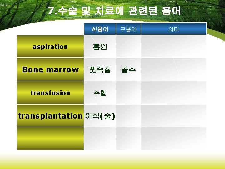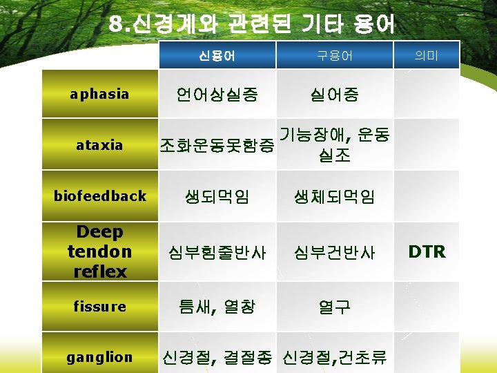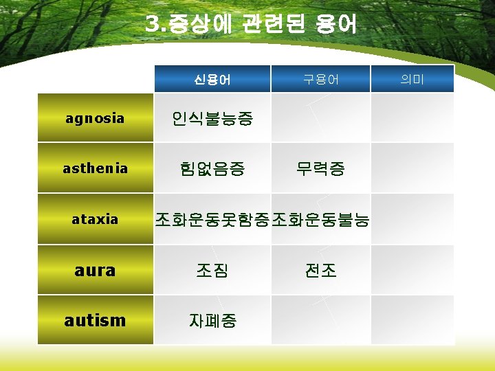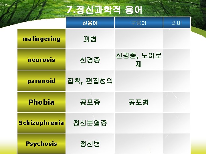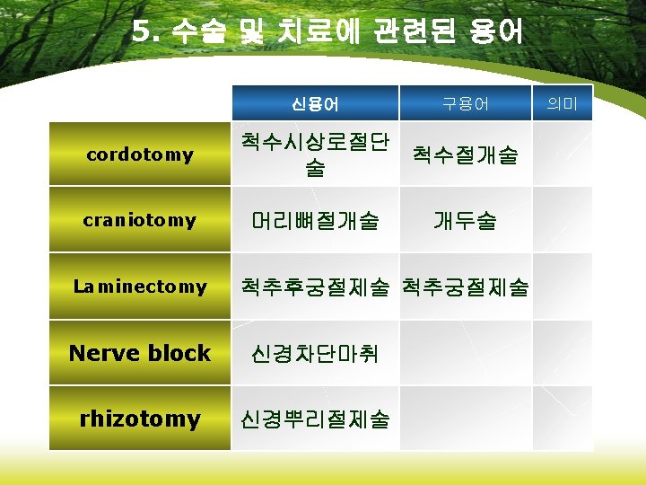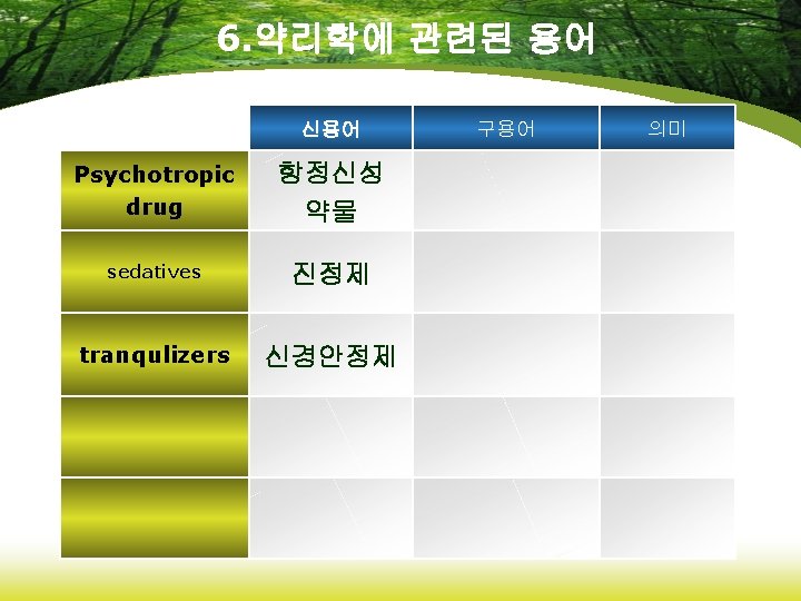 6. 약리학에 관련된 용어 신용어 analgesics 진통제 anticonvulsants 항경련약 antidepressants 항우울제 hypnotics 수면제 opiates 아편제 구용어 의미