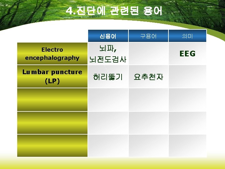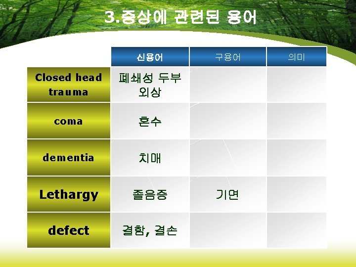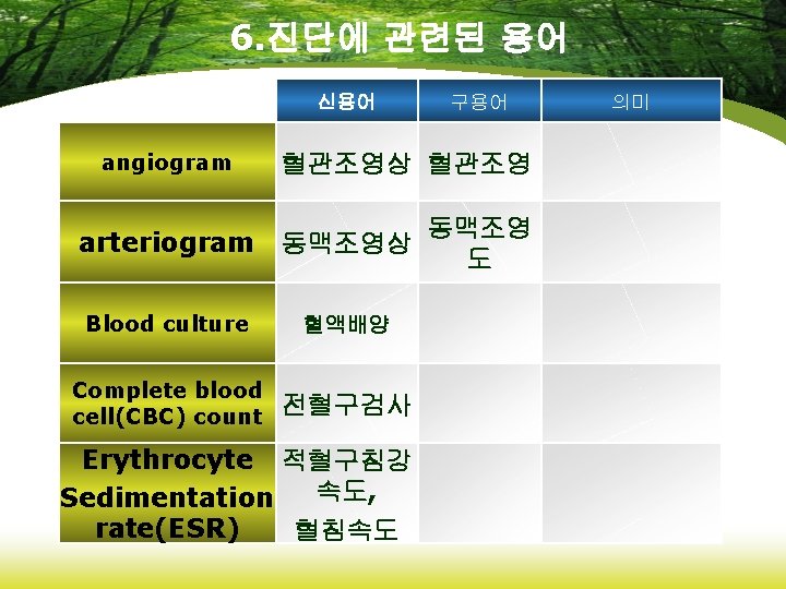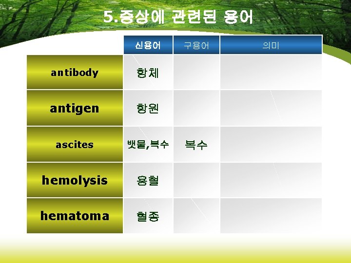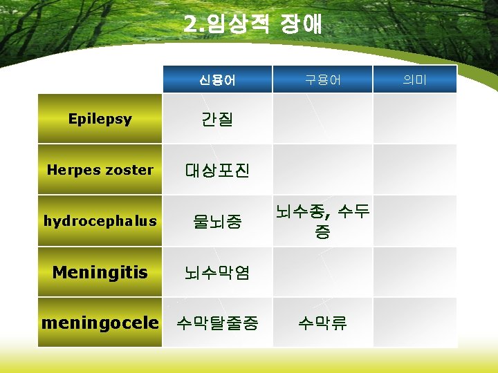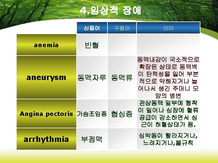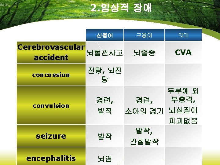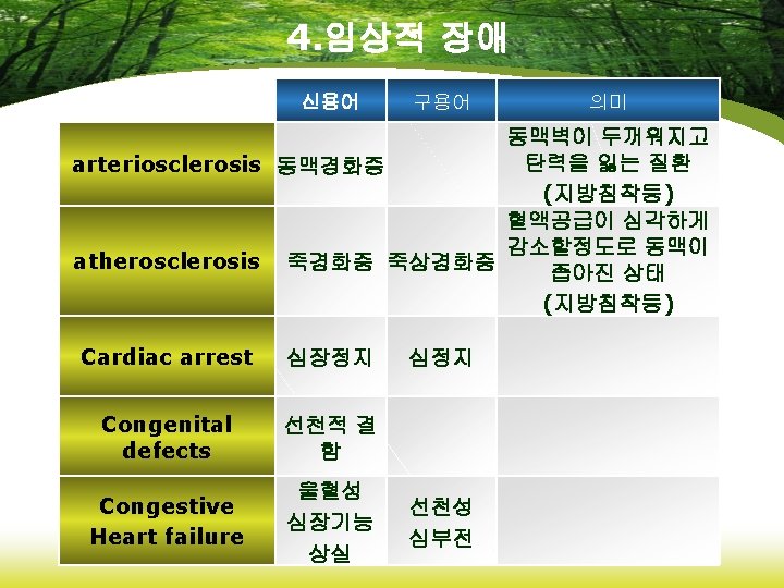 4. 임상적 장애 신용어 Cerebrovascular Accident(CVA) 뇌혈관사 뇌졸중 고 thrombophlebitis 혈전정맥 염 Transient ischemic Attack(TIA) 일과성 허혈발작 Varicose vein 구용어 정맥자루 정맥류 의미