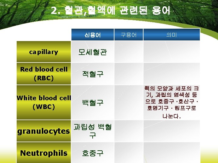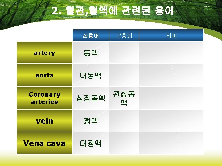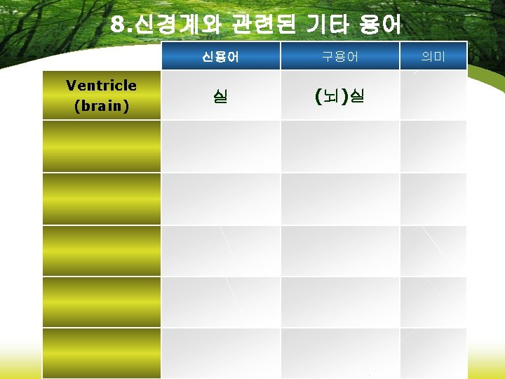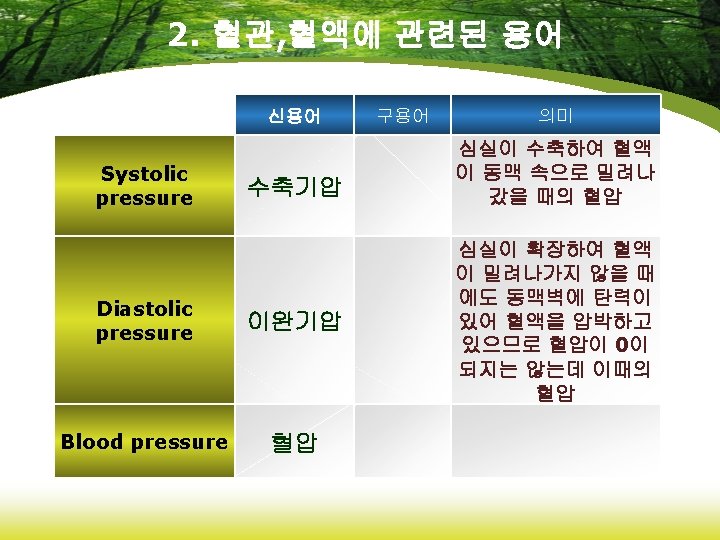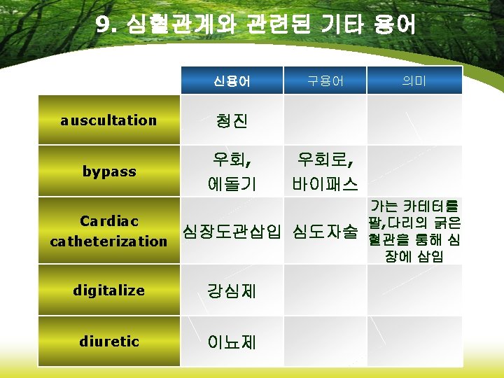 8. 약리학에 관련된 용어 신용어 anticoagulants 항응고제 fibrinolytics 섬유소 용해제 hemostatics 지혈제 Immunosuppressive agents 면역억제제 vaccines 백신 구용어 의미