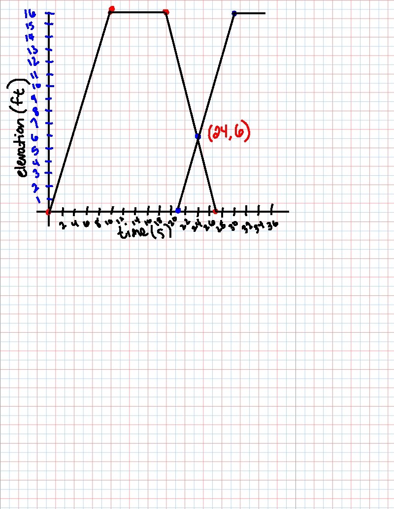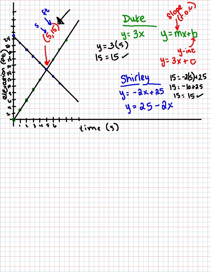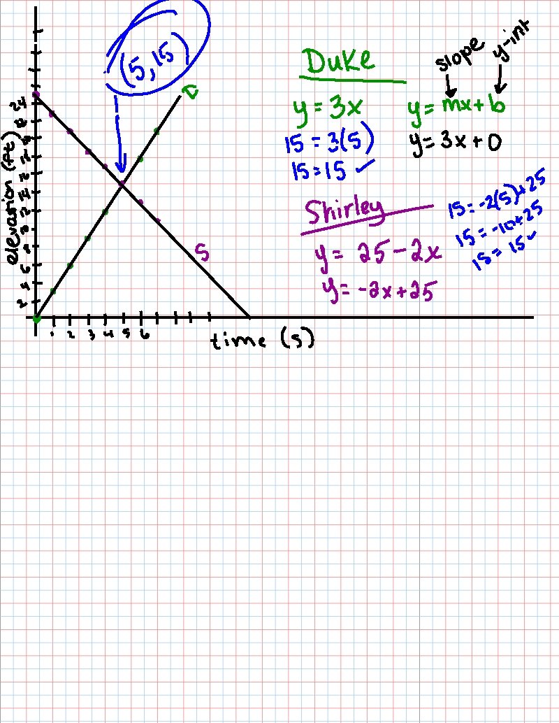 Example 2/Exercises 5– 7 Consider the story: Duke starts at the base of a ramp and walks up it at a constant rate. His elevation increases by 3 ft. every second. Just as Duke starts walking up the ramp, Shirley starts at the top of the same 25 ft. high ramp and begins walking down the ramp at a constant rate. Her elevation decreases 2 ft. every second. 5) Sketch two graphs on the same set of elevation-versus-time axes to represent Duke’s and Shirley’s motions. 6) What are the coordinates of the point of intersection of the two graphs? At what time do Duke and Shirley pass each other? 7) Write down the equation of the line that represents Duke’s motion as he moves up the ramp and the equation of the line that represents Shirley’s motion as she moves down the ramp. Show that the coordinates of the point you found in the question above satisfy both equations.