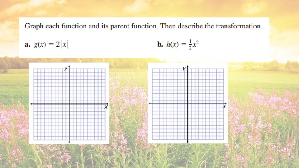 Graph the function and its parent function. Then describe the transformation. 1. g(x) = x + 4 2. f(x) = x − 6