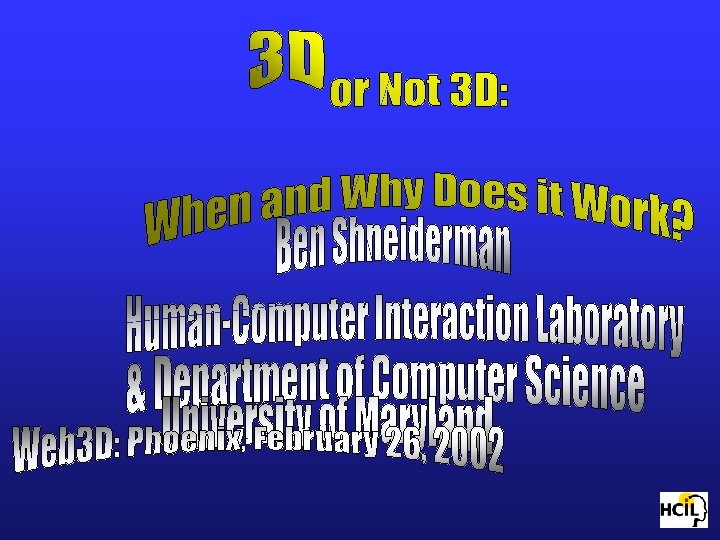 or Not 3 D: When and Why Does it Work? Ben Shneiderman Human-Computer Interaction Laboratory & Department of Computer Science University of Maryland Web 3 D: Phoenix, February 26, 2002