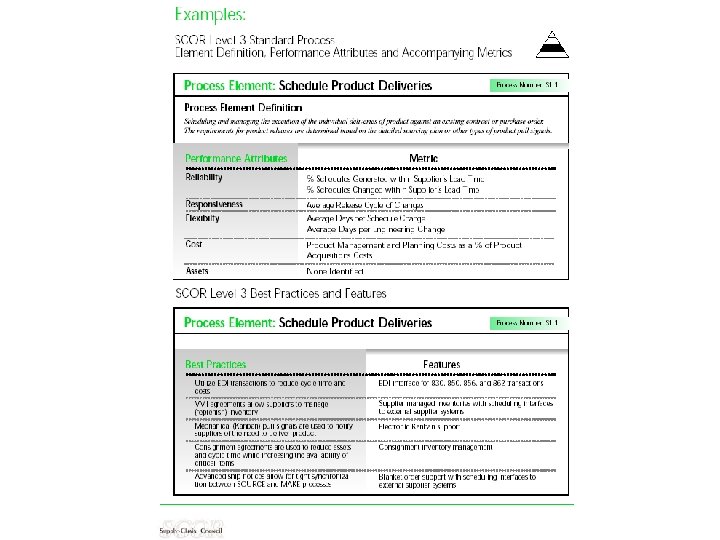 SCOR: Three levels of process detail 1. Top level 1. Defines the scope and content for the SCOR model 2. Basis of competition performance target set 2. Configuration level 1. Representation of the company’s supply chain using 30 core “process categories” 3. Process Element level 1. Defines company’s ability to compete in chosen market 2. Process element definitions, inputs, outputs, systems/tools; 3. Performance metrics, best practices, systems capabilities 4. Implementation level 1. Defines practices to achieve competitive advantage and adapt to change