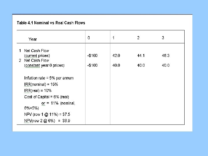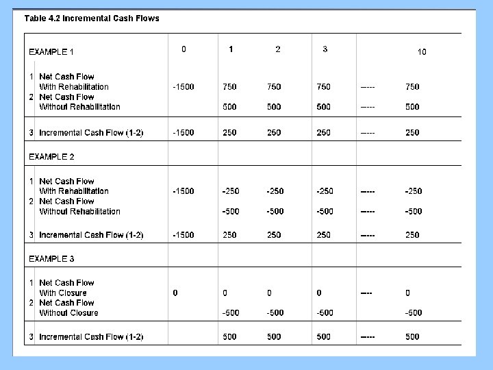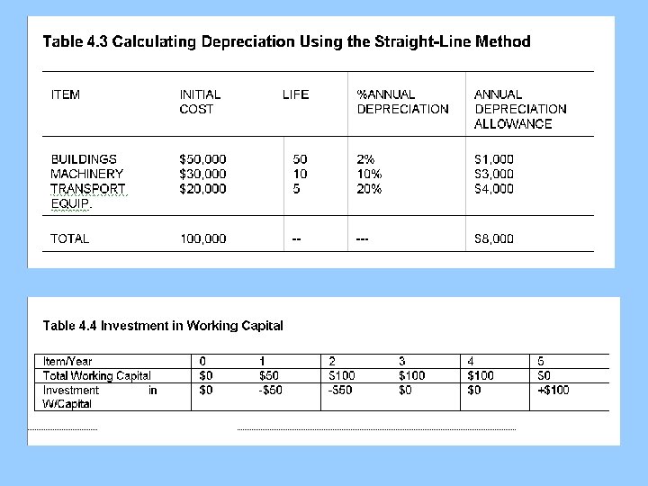 Deriving Project Cash Flow • Depreciation excluded from cost to avoid double counting. (See table 4. 3) • Changes in working capital appear under investment costs at the beginning and end of the project. (See table 4. 4) • Interest on debt excluded from cost to avoid double counting.