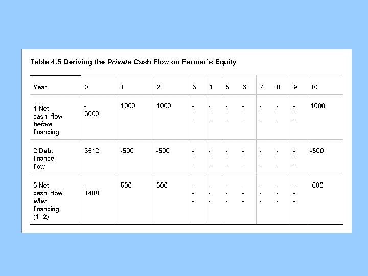 Private Cash Flow (Equity) To derive private cash flow, for each period, before tax: • Add debt financing flow to project cash flow. (See table 4. 5)