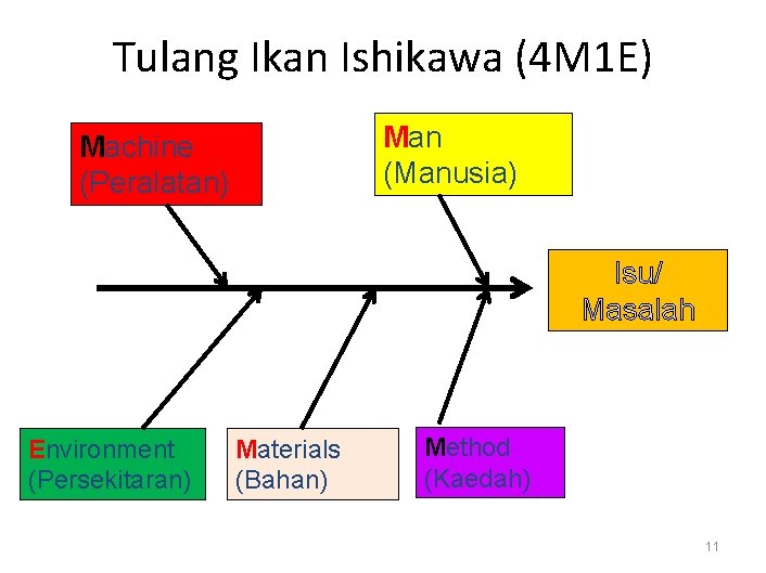 Tulang Ikan Ishikawa (4 M 1 E) Man (Manusia) Machine (Peralatan) Isu/ Masalah Environment (Persekitaran) Materials (Bahan) Method (Kaedah) 11
