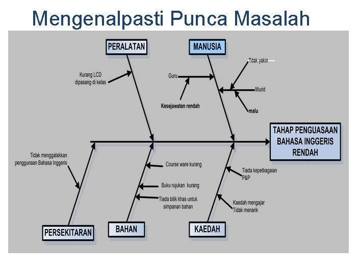 Isu : Prestasi BI rendah 1 Kumpulan sasaran Satu senarai nama murid yang menghadapi masalah berkenaan 2 Punca Masalah Punca A Punca B 3 Senarai Intervensi i. Intervensi 1 ii. Intervensi 2 iii. Intervensi 3 Punca C i. Intervensi 1 ii. Intervensi 2 iii. Intervensi 3 14