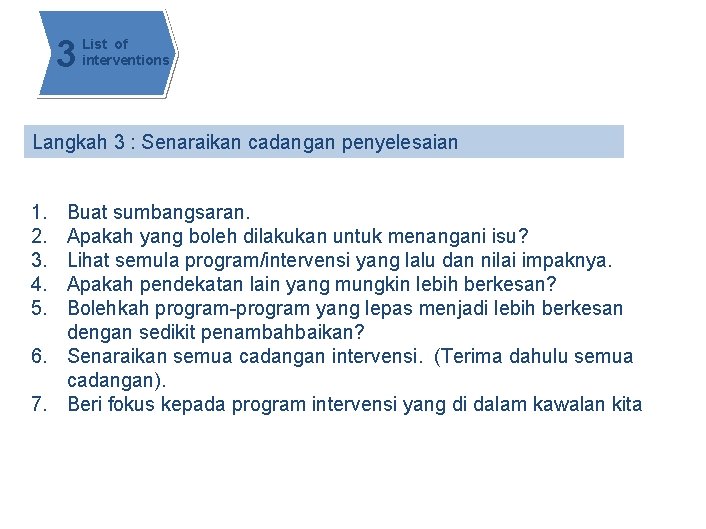 3 List of interventions Langkah 3 : Senaraikan cadangan penyelesaian 1. 2. 3. 4. 5. Buat sumbangsaran. Apakah yang boleh dilakukan untuk menangani isu? Lihat semula program/intervensi yang lalu dan nilai impaknya. Apakah pendekatan lain yang mungkin lebih berkesan? Bolehkah program-program yang lepas menjadi lebih berkesan dengan sedikit penambahbaikan? 6. Senaraikan semua cadangan intervensi. (Terima dahulu semua cadangan). 7. Beri fokus kepada program intervensi yang di dalam kawalan kita