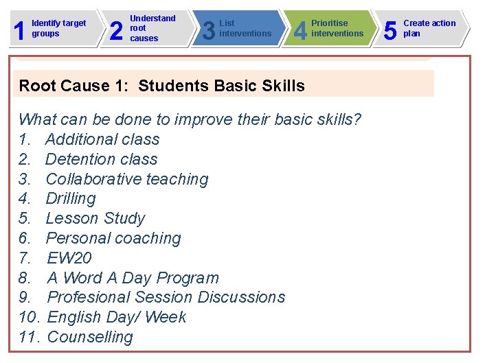1 Identify target groups 2 Understand root causes 3 List interventions 4 Prioritise interventions Students Basic Skills Impact Additional class Detention class Collaborative teaching Drilling English Day Counselling Ease of implementation 5 Create action plan