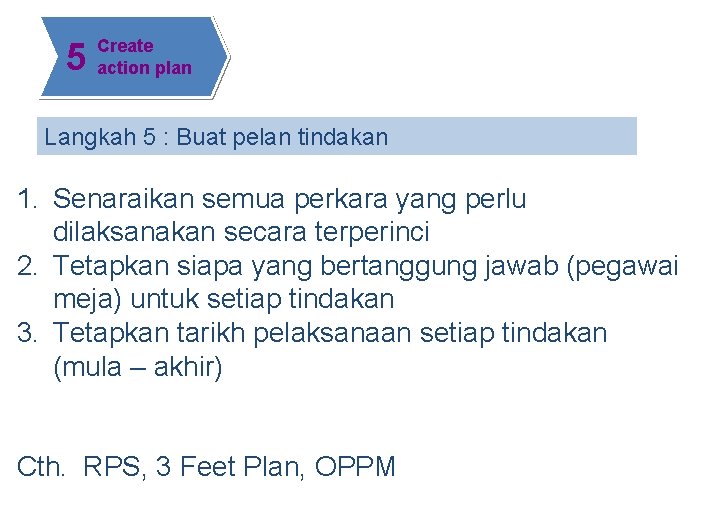 5 Create action plan Langkah 5 : Buat pelan tindakan 1. Senaraikan semua perkara yang perlu dilaksanakan secara terperinci 2. Tetapkan siapa yang bertanggung jawab (pegawai meja) untuk setiap tindakan 3. Tetapkan tarikh pelaksanaan setiap tindakan (mula – akhir) Cth. RPS, 3 Feet Plan, OPPM