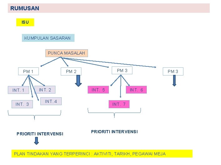RUMUSAN ISU KUMPULAN SASARAN PUNCA MASALAH PM 1 INT. 3 PM 2 INT. 4 PRIORITI INTERVENSI PM 3 INT. 6 INT. 5 INT. 7 PRIORITI INTERVENSI PLAN TINDAKAN YANG TERPERINCI : AKTIVITI, TARIKH, PEGAWAI MEJA