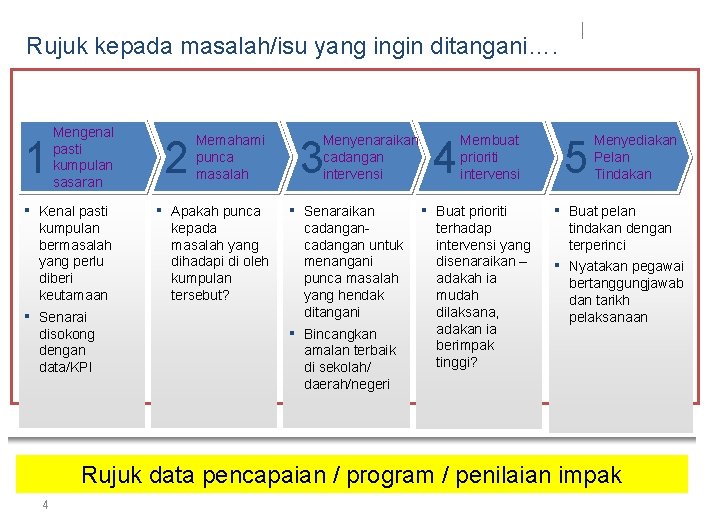 Rujuk kepada masalah/isu yang ingin ditangani…. 1 ▪ ▪ Mengenal pasti kumpulan sasaran Kenal pasti kumpulan bermasalah yang perlu diberi keutamaan Senarai disokong dengan data/KPI 2 ▪ Menyenaraikan cadangan intervensi Memahami punca masalah Apakah punca kepada masalah yang dihadapi di oleh kumpulan tersebut? 3 ▪ ▪ Senaraikan cadangan untuk menangani punca masalah yang hendak ditangani Bincangkan amalan terbaik di sekolah/ daerah/negeri 4 ▪ Membuat prioriti intervensi Buat prioriti terhadap intervensi yang disenaraikan – adakah ia mudah dilaksana, adakan ia berimpak tinggi? 5 Menyediakan Pelan Tindakan ▪ Buat pelan tindakan dengan terperinci ▪ Nyatakan pegawai bertanggungjawab dan tarikh pelaksanaan Rujuk data pencapaian / program / penilaian impak 4