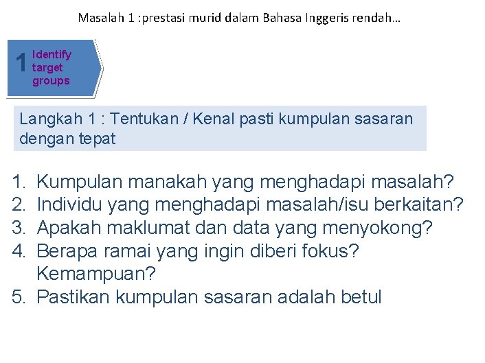 Masalah 1 : prestasi murid dalam Bahasa Inggeris rendah… 1 Identify target groups Langkah 1 : Tentukan / Kenal pasti kumpulan sasaran dengan tepat 1. 2. 3. 4. Kumpulan manakah yang menghadapi masalah? Individu yang menghadapi masalah/isu berkaitan? Apakah maklumat dan data yang menyokong? Berapa ramai yang ingin diberi fokus? Kemampuan? 5. Pastikan kumpulan sasaran adalah betul