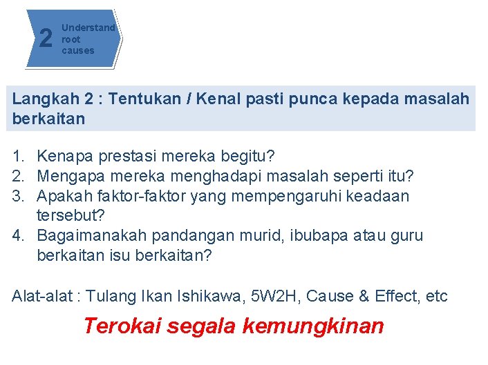 2 Understand root causes Langkah 2 : Tentukan / Kenal pasti punca kepada masalah berkaitan 1. Kenapa prestasi mereka begitu? 2. Mengapa mereka menghadapi masalah seperti itu? 3. Apakah faktor-faktor yang mempengaruhi keadaan tersebut? 4. Bagaimanakah pandangan murid, ibubapa atau guru berkaitan isu berkaitan? Alat-alat : Tulang Ikan Ishikawa, 5 W 2 H, Cause & Effect, etc Terokai segala kemungkinan