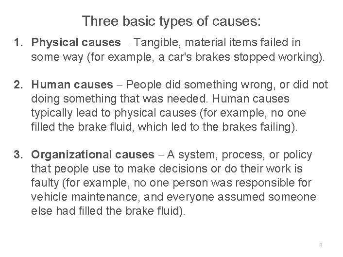 Three basic types of causes: 1. Physical causes – Tangible, material items failed in some way (for example, a car's brakes stopped working). 2. Human causes – People did something wrong, or did not doing something that was needed. Human causes typically lead to physical causes (for example, no one filled the brake fluid, which led to the brakes failing). 3. Organizational causes – A system, process, or policy that people use to make decisions or do their work is faulty (for example, no one person was responsible for vehicle maintenance, and everyone assumed someone else had filled the brake fluid). 8