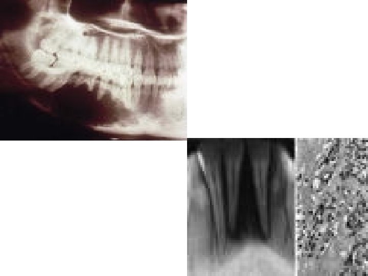 R/F APPEARANCE DEPENDS UPON STAGE OF DEVELOPEMENT INITIAL RADIOLUCENCY MATURE LESION RADIOLUCENT WITH RADIO-OPAQUE FLECKS LATER RADIO-OPAQUE MASSES WELL DEFINED/CIRCUMSCRIBED AND DEMARCATED LESION FROM SURROUNDING DISPLACEMENT OF TEETH