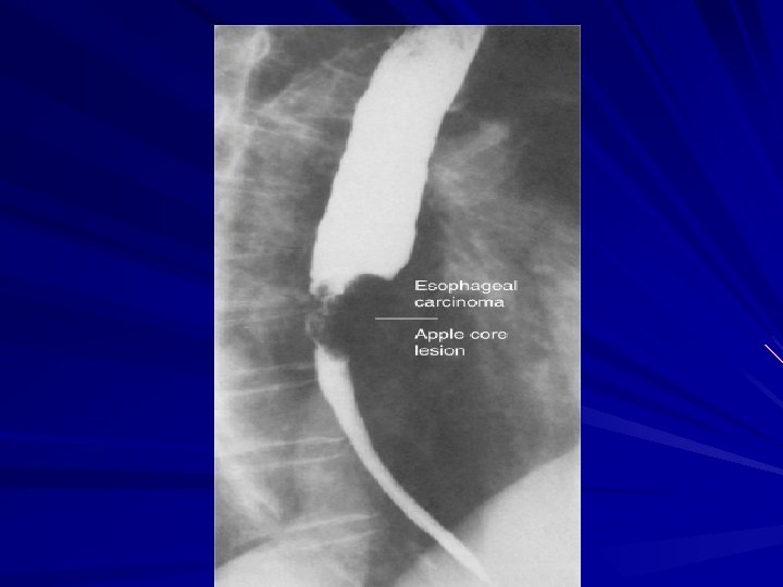 Esophagram The classic finding of an apple-core lesion in patients with esophageal cancer is recognized easily Although the esophagram will not be specific for cancer, it is a good first test to perform in patients presenting with dysphagia and a suspicion of esophageal cancer