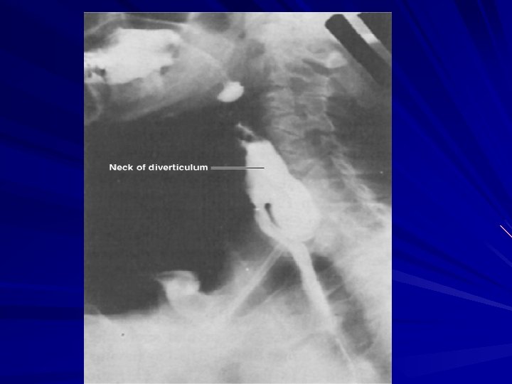 Symptoms and Diagnosis Commonly, patients complain of a sticking in the throat. nagging cough, excessive salivation, and intermittent dysphagia often are signs of progressive disease As the sac increases in size, regurgitation of foul-smelling, undigested material is common