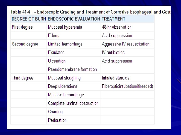 Treatment First-Degree Burn : 48 hours of observation is indicated Oral nutrition can be resumed when a patient can painlessly swallow saliva A repeat endoscopy and barium esophagram are done in follow-up at intervals of 1, 2, and 8 months