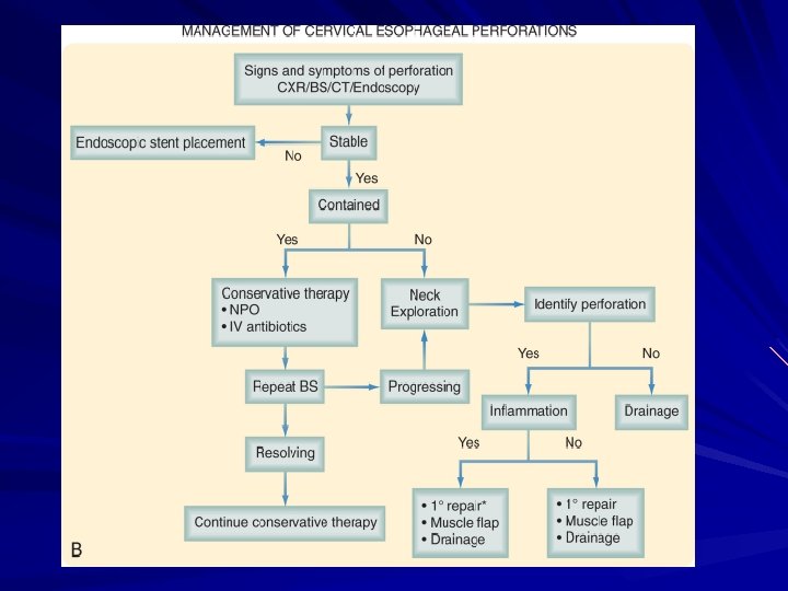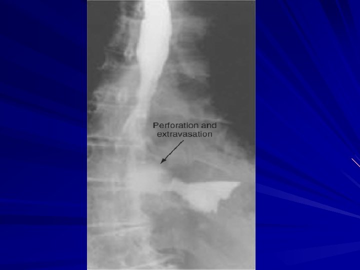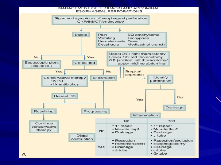 Esophageal Perforation of the esophagus is a surgical emergency Early detection and surgical repair within the first 24 hours results in 80% to 90% survival after 24 hours, survival decreases to less than 50%