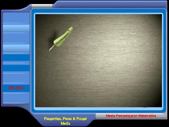 BERANDA PENGERTIAN PERAN FUNGSI SELESAI PERAN MEDIA Mengatasi perbedaan pengalaman pribadi Mengatasi batas-batas ruang dan waktu Mengatasi kesulitan apabila suatu benda yang diamati terlalu kecil Mengatasi gerak benda secara cepat atau lambat Mengatasi hal-hal yang terlalu kompleks untuk dipisahkan Pengertian, Peran & Fungsi Media Pempelajaran Matematika