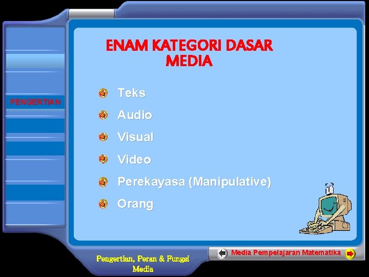 BERANDA PENGERTIAN PERAN FUNGSI SELESAI ENAM KATEGORI DASAR MEDIA Teks Audio Visual Video Perekayasa (Manipulative) Orang Pengertian, Peran & Fungsi Media Pempelajaran Matematika