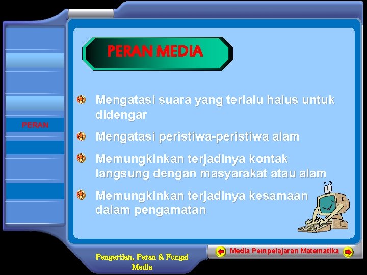 BERANDA PENGERTIAN PERAN FUNGSI SELESAI PERAN MEDIA Mengatasi suara yang terlalu halus untuk didengar Mengatasi peristiwa-peristiwa alam Memungkinkan terjadinya kontak langsung dengan masyarakat atau alam Memungkinkan terjadinya kesamaan dalam pengamatan Pengertian, Peran & Fungsi Media Pempelajaran Matematika