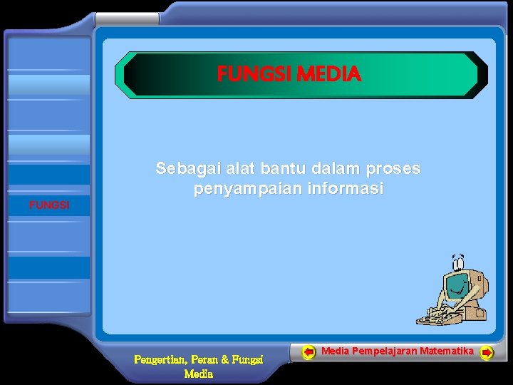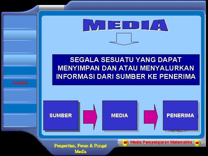 BERANDA PENGERTIAN PERAN SEGALA SESUATU YANG DAPAT MENYIMPAN DAN ATAU MENYALURKAN INFORMASI DARI SUMBER KE PENERIMA FUNGSI SELESAI SUMBER Pengertian, Peran & Fungsi Media MEDIA PENERIMA Media Pempelajaran Matematika