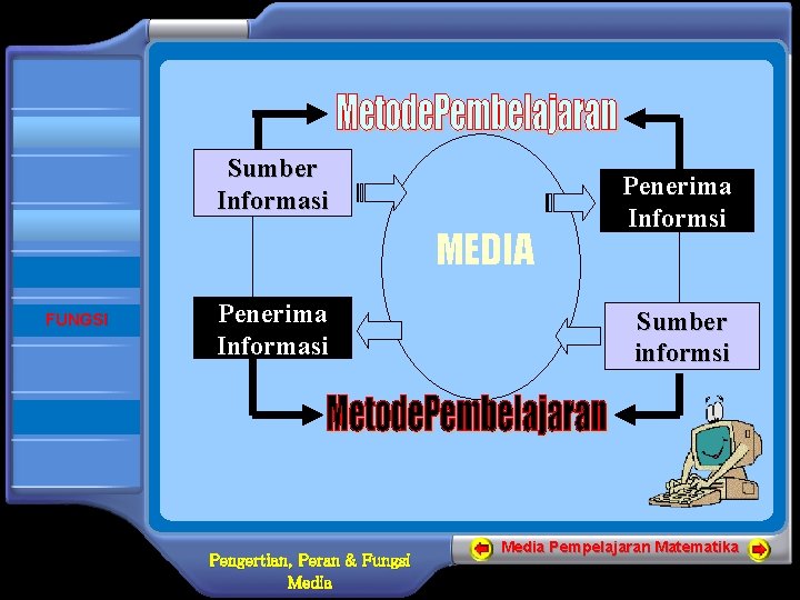 BERANDA Sumber Informasi PENGERTIAN MEDIA PERAN FUNGSI Penerima Informasi Penerima Informsi Sumber informsi SELESAI Pengertian, Peran & Fungsi Media Pempelajaran Matematika