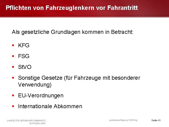 Pflichten von Fahrzeuglenkern vor Fahrantritt Als gesetzliche Grundlagen kommen in Betracht: KFG FSG St. VO Sonstige Gesetze (für Fahrzeuge mit besonderer Verwendung) EU-Verordnungen Internationale Abkommen LANDESFEUERWEHRKOMMANDO BURGENLAND Lenkberechtigung 5. 500 kg Seite 3