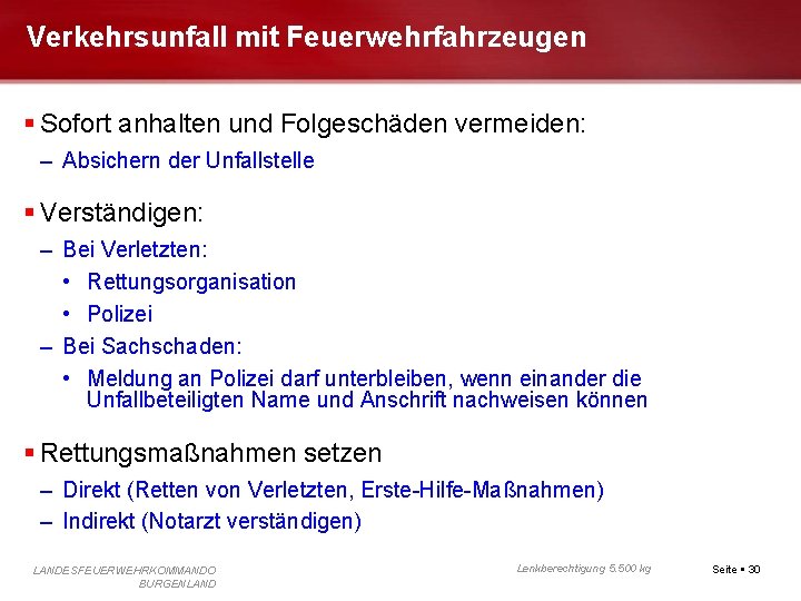 Verkehrsunfall mit Feuerwehrfahrzeugen Sofort anhalten und Folgeschäden vermeiden: – Absichern der Unfallstelle Verständigen: – Bei Verletzten: • Rettungsorganisation • Polizei – Bei Sachschaden: • Meldung an Polizei darf unterbleiben, wenn einander die Unfallbeteiligten Name und Anschrift nachweisen können Rettungsmaßnahmen setzen – Direkt (Retten von Verletzten, Erste-Hilfe-Maßnahmen) – Indirekt (Notarzt verständigen) LANDESFEUERWEHRKOMMANDO BURGENLAND Lenkberechtigung 5. 500 kg Seite 30