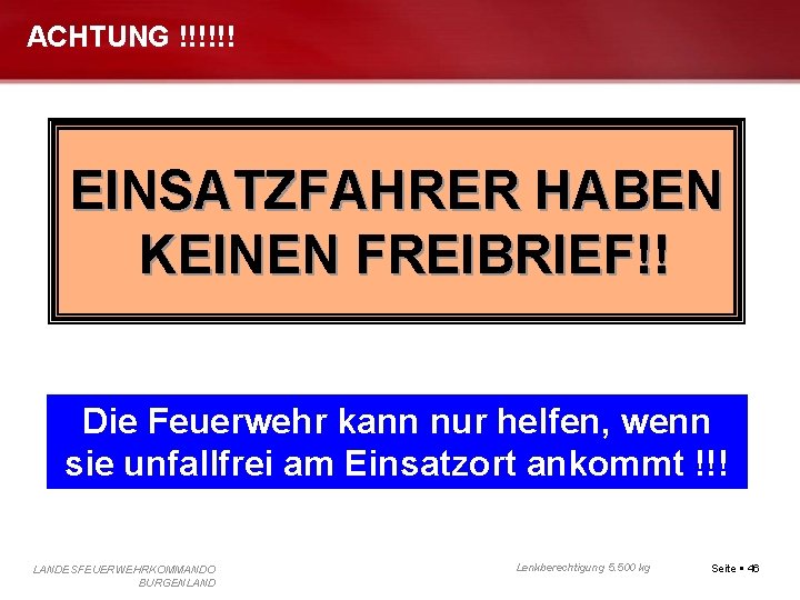 ACHTUNG !!!!!! EINSATZFAHRER HABEN KEINEN FREIBRIEF!! Die Feuerwehr kann nur helfen, wenn sie unfallfrei am Einsatzort ankommt !!! LANDESFEUERWEHRKOMMANDO BURGENLAND Lenkberechtigung 5. 500 kg Seite 46