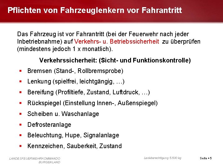 Überprüfungspflicht von Kraftfahrzeugen und Anhängern Der Kraftfahrzeuglenker darf ein Fahrzeug erst in Betrieb nehmen, wenn er sich, soweit dies zumutbar ist, davon überzeugt hat, dass das von ihm zu lenkende Kraftfahrzeug und ein mit diesem zu ziehender Anhänger sowie deren Beladung den hierfür in Betracht kommenden Vorschriften entsprechen. Überprüfung auf: Verkehrs- und Betriebssicherheit Sämtliche Bauvorschriften Sämtliche Verwendungs- und Verhaltensvorschriften LANDESFEUERWEHRKOMMANDO BURGENLAND Lenkberechtigung 5. 500 kg Seite 4