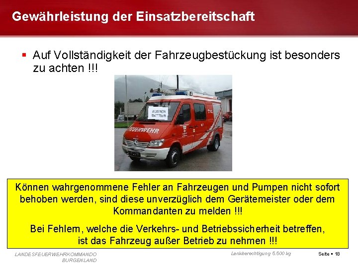 Gewährleistung der Einsatzbereitschaft Auf Vollständigkeit der Fahrzeugbestückung ist besonders zu achten !!! Können wahrgenommene Fehler an Fahrzeugen und Pumpen nicht sofort behoben werden, sind diese unverzüglich dem Gerätemeister oder dem Kommandanten zu melden !!! Bei Fehlern, welche die Verkehrs- und Betriebssicherheit betreffen, ist das Fahrzeug außer Betrieb zu nehmen !!! LANDESFEUERWEHRKOMMANDO BURGENLAND Lenkberechtigung 5. 500 kg Seite 18