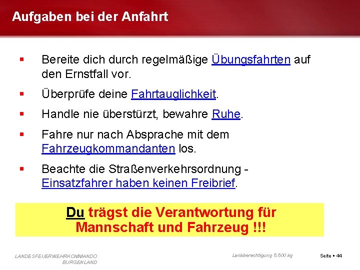 Gefahrenlehre Gefährliche Partner – Kinder, unaufmerksame bzw. überforderte Verkehrsteilnehmer Gefährliche Situationen – starker Seitenwind, riskante Überholmanöver, Unfälle Aufregung, Stress bei der Einsatzfahrt – Nachteinsatz (Schlafunterbrechung) – Einsatzstichwort (z. B. Kinder verletzt, usw. ) LANDESFEUERWEHRKOMMANDO BURGENLAND Lenkberechtigung 5. 500 kg Seite 43