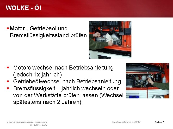 WOLKE - Öl Motor-, Getriebeöl und Bremsflüssigkeitsstand prüfen Motorölwechsel nach Betriebsanleitung (jedoch 1 x jährlich) Getriebeölwechsel nach Betriebsanleitung Bremsflüssigkeit – jährlich wechseln oder von der Werkstätte prüfen lassen (Wechsel spätestens nach 2 Jahren) LANDESFEUERWEHRKOMMANDO BURGENLAND Lenkberechtigung 5. 500 kg Seite 8