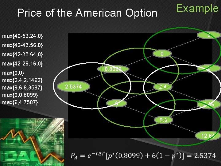 Example Price of the American Option 0 max{42 -53. 24, 0} max{42 -43. 56, 0} 0 max{42 -35. 64, 0} max{42 -29. 16, 0} max{0, 0} max{2. 4, 2. 1462} max{9. 6, 8. 3587} max{0, 0. 8099} max{6, 4. 7587} 0 0. 8099 2. 5374 2. 4 6 6. 36 9. 6 12. 84