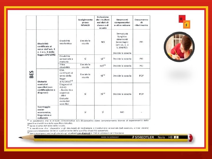 dei documenti Legge 8 ottobre 2010 n. 170 Nuove norme in materia di Disturbi specifici di apprendimento in ambito scolastico Decreto Ministeriale 12 luglio 2011 n. 5669 Decreto attuativo della Legge n. 170/2010. Linee guida per il diritto allo studio degli alunni e degli studenti con disturbi specifici di apprendimento. Direttiva MIUR 27 dicembre 2012 Strumenti di intervento per alunni con bisogni educativi speciali e organizzazione territoriale per l’inclusione scolastica. C. M. n. 8 del 6 marzo 2013 Strumenti di intervento per alunni con bisogni educativi speciali e organizzazione territoriale per l’inclusione scolastica. Indicazioni operative. Ordinanza Ministeriale del 03/06/2014 n. 3587 Istruzioni e modalità organizzative e operative per lo svolgimento degli Esami di Stato conclusivi del Primo Ciclo di istruzione. Nota MIUR 2563 del 22. 11. 2013 - Strumenti di intervento per alunni con bisogni educativi speciali a. s. 2013 -2014 - Chiarimenti.
