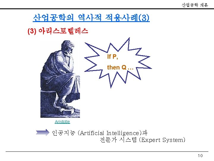 산업공학 개론 산업공학의 주요 발전 내용 (1) 시기 주요주제 - SCIENTIFIC MANAGEMENT, TIME STUDY, MOTION STUDY 1910 – 1950 - MASS PRODUCTION, FORD ASSEMBLY LINE - INTRODUCTION OF INVENTORY CONTROL, EOQ - HUMAN STUDY, HAWTHORNE STUDY. - INTRODUCTION OF SQC (Statistical Quality Control) - MANAGEMENT SCIENCE, DEVELOPMENT OF OR (Operations 1950 s 1960 s Research) TOOLS - EARLIEST USE OF COMPUTERS - OVERALL CONCEPT OF PLANNING/CONTROL, IBM’S 1970 s COPICS, MRP - EXTENSIVE USE OF COMPUTERS 31