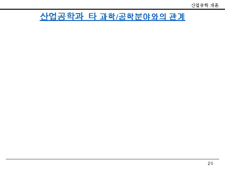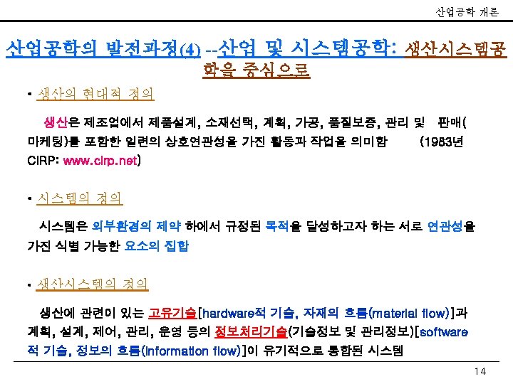산업공학 개론 산업공학(Industrial Engineering)의 정의 산업공학이란 사람, 재료, 정보, 설비 및 에너지로 이루어진 통합적인 시스템을 설계, 개선 및 설치하는 것을 다루는 공학분야이다. 산업공 학은 이러한 시스템으로부터 얻어질 수 있는 결과를 명시하고, 예측하 며, 평가하기 위하여 공학적 분석과 설계에 관한 원리 및 방법 뿐만 아 니라 수학, 자연과학 및 사회과학에 대한 지식과 능력을 활용한다 (Institute of Industrial Engineers (IIE)의 정의, 1956) Industrial Engineering is concerned with the design, improvement and installation of integrated systems of people, material, information, equipment and energy. It draws upon specialized knowledge and skills in the mathematical, physical and social science together with the principles and methods of engineering analysis and design to specify, predict and evaluate the results to be oriented from such systems. (참조 : www. iienet. org) 17