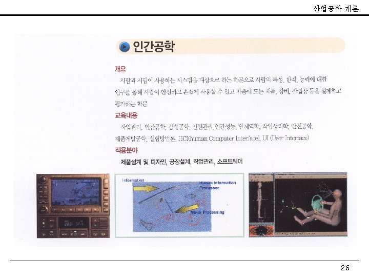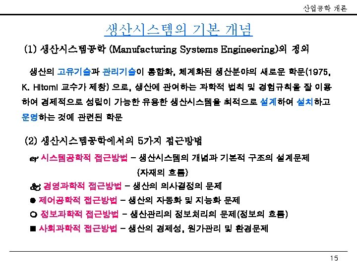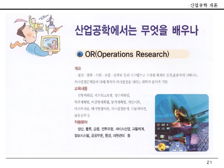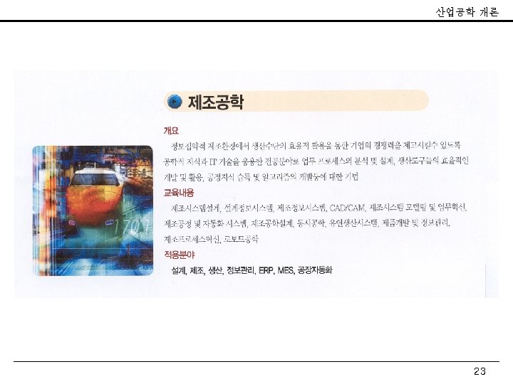 산업공학 개론 산업공학 교육의 방향(4) Enterprise Integration Collaborative Manufacturing/ E-manufacturing Information Technology Service Industry /Public Sector Application • Transportation and Logistics System • Communication System • Finance & Public System * Source: IE Magazine 2003. 8 30