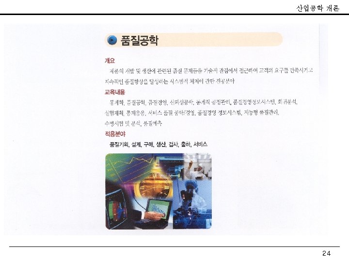 산업공학 개론 산업공학 교육의 방향(3) Enterprise Integration Collaborative Manufacturing/ E-manufacturing Information Technology Service Industry /Public Sector Application • Database & Data Modeling • Data Structure & Algorithm Application • Object Modeling & SW Engineering • Internet Application System * Source: IE Magazine 2003. 8 29
