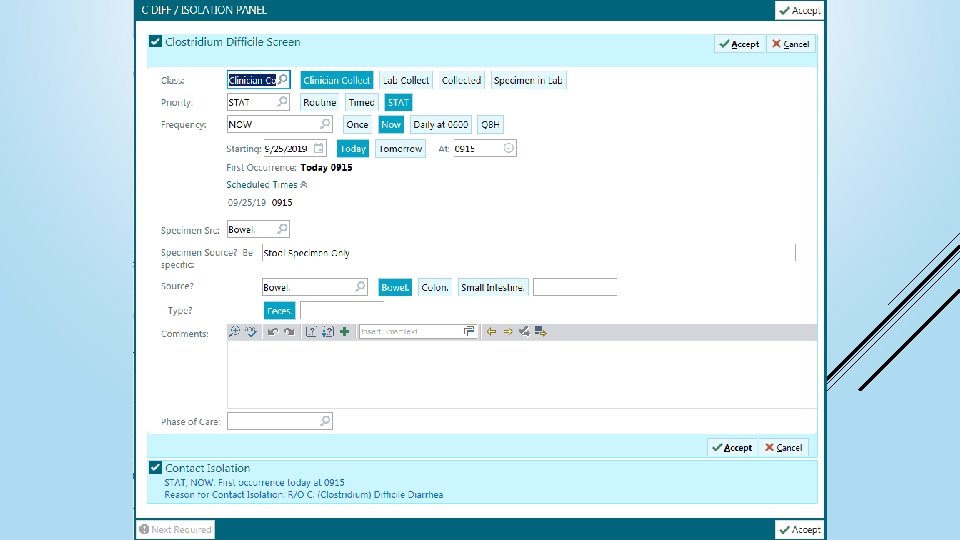 If CDI is suspected <2 days from admission do not delay ordering the test Order C Diff tests through the “C DIFF / ISOLATION PANEL” so infection prevention can follow ORDERING C DIFF TESTS