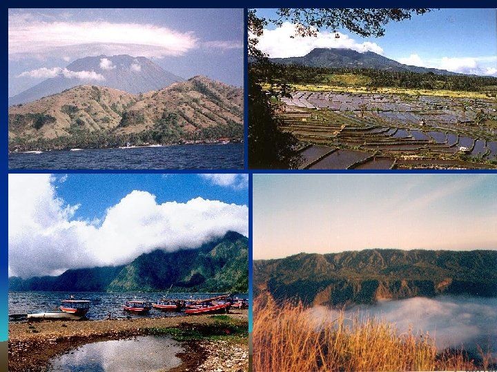 Geographical Location • Consists of a chain of 6 volcanoes, between 1350 m to 3014 m, which stretches from west to east, with Gunung Agung being the tallest • Has lush tropical forests, crater lakes, rivers, rice terraces, fertile vegetable and fruit gardens • The most important form of agriculture on the island is the rice crop