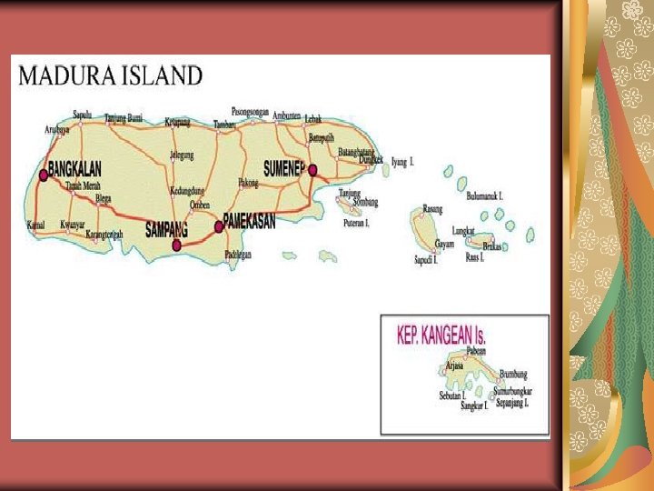 BACKGROUND INFO Long, narrow island near northeast coast of Java Pamekasan, the capital area of approximately 4, 250 km², 66 outlying islands