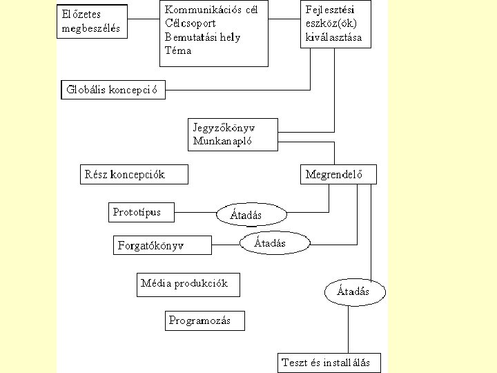 Munkanapló n n n n Megrendelő és fejlesztő csoport közötti kontakt személy megnevezése Projekt leírás, kommunikációs cél, felhasználási célcsoport, tervezett bemutatási hely, tartalom. Egész multimédia -prezentáció futásideje. Egyes részek (témák) tanulási ideje. Interakció és navigáció struktúra. Interakció és navigáció-elemek dramaturgia (történet, játékos elemek, stb…. ) Média betétek (film, hang stb…) Hasznos lehet egy árlista
