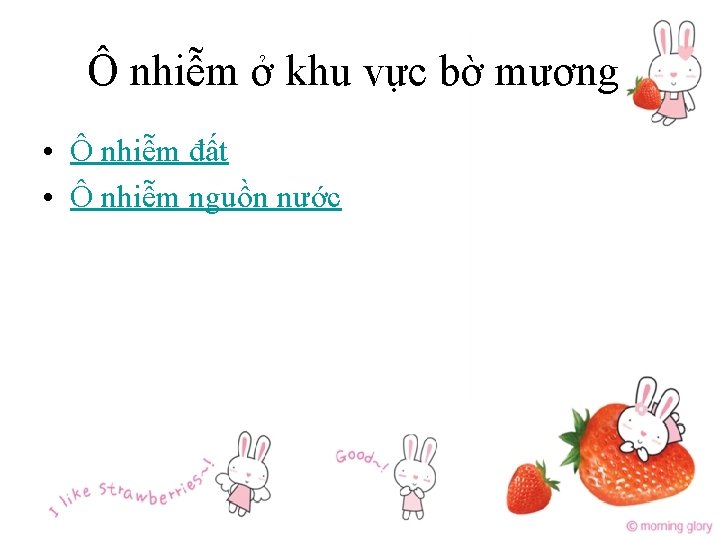 • Thực trạng: • Người dân chưa có ý thức giữ gìn và bảo về môi trường, còn xả rác bừa bãi. • Các chất thải rắn như bao bì ni lông, chai thuốc bảo vệ thực vật, thuốc trừ sâu, . . . sau khi sử dụng bị vứt bừa bãi, ngấm vào đất, các chất này đều là các chất khó phân hủy nên gây ra sự ô nhiễm đất. • Giải pháp: • Thường xuyên truyền về việc bảo vệ môi trường, nâng cao hiểu biết của người dân về tác hại của ô nhiễm môi trường, đặc biệt là ô nhiễm đất và nguồn nước gần nơi người dân sinh sống sẽ ảnh hưởng xấu như thế nào đến sức khỏe của con người.