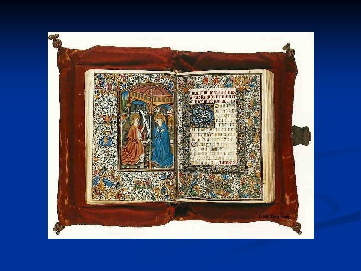 Middle Age Bible Form n n Handwritten Written on parchment (late Middle Ages: Paper ) n Illuminated manuscript (Narrow sense: manuscripts decorated with gold or silver Broader sense: decorative or illustrated manuscript) n n Decorated with miniature illustrations Decorated initial