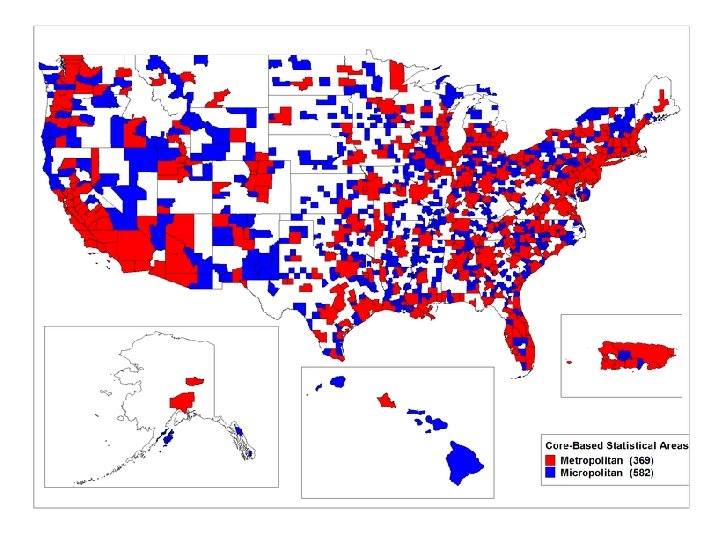 What is connected to what? 1. City 2. Urbanized Area 3. Metropolitan Area Ø A functional area Ø A continuously built up area Ø A legal entity q. Pop Density > 1000/sq mile) q. Area with at least 50, 000 and adjacent counties with density of 25 people/ sq mile and 50% work in central city.